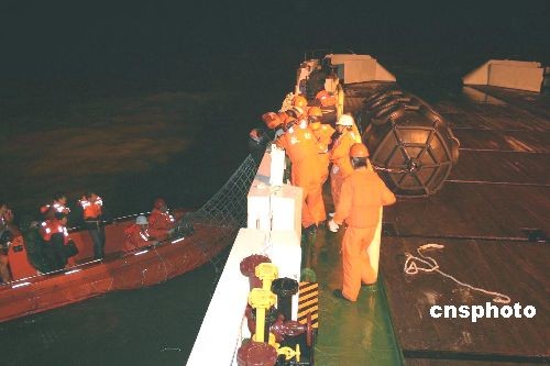 2月27日晚,一艘滿載950噸煤灰的“福順六號”貨輪在廈門鎮海角附近觸礁擱淺,導致船艙大量進水,嚴重傾斜。經過交通部東海救助局“東海救一三一”的全力救助,遇險船上8名船員全部獲救。圖為救助船施放救生艇把遇險船員安全轉送到“東海救一三一”輪。中新社發 東海 攝