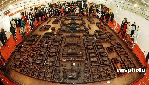3月20日,為期5天的“第六屆全國工藝品、旅游品、禮品博覽會暨第十一屆春季(大連)中國古玩藝術品博覽會”在大連星海會展中心舉行。在展會西廳區,一個一展現古都風貌喜迎2008年奧運會為創作宗旨的按正式比例縮小120倍的紫檀巨雕故宮全景,吸引了眾多市民的眼球。這個作品9米長,寬7米,總面積60余平方米,由50余位高級技師歷時6年精心雕制而成。該作品無論從用料、耗時都令人稱絕。如此大型紫檀木雕藝術作品也實屬罕見。中新社發 劉德斌 攝