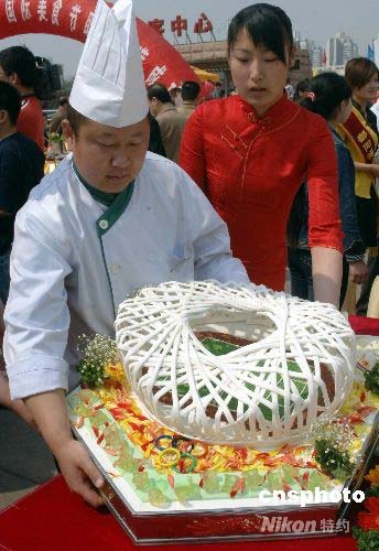2000年4月24日,北京中央電視塔廣場(chǎng),第六屆中關(guān)村國(guó)際美食節(jié)開幕式在此隆重開幕。飲食企業(yè)和社團(tuán)派出精兵強(qiáng)將,在“綠色餐飲.奧運(yùn)美食”流行經(jīng)典菜式的展示活動(dòng)中展示自家拿手的菜肴。圖為一家餐廳展示制作精良的美食制品《鳥巢》。中新社發(fā) 鄒憲 攝