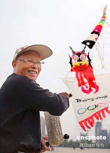 4月29日,河南洛陽“迎奧運倒計時100天全民健身月”活動開幕,洛陽民眾以千人舞太極、抖空竹表演、少兒輪滑表演、風箏比賽等群眾性文體活動迎接奧運。圖為76歲老人鄧林放飛長達280米奧運主題風箏。中新社發 曾憲平 攝