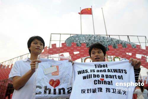 五月三日,廣州天河廣場,廣東青年鄭凱升和朋友一起向路人售賣自己策劃制作的愛國T恤。五月七日,北京奧運圣火將在廣州傳遞。中新社發 廖攀 攝