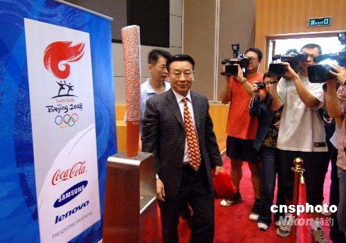 5月9日,2008北京奧運會火炬接力境內傳遞(福建站)組委會在福州舉行新聞發布會并向眾多媒體記者展示祥云火炬。中新社發 劉可耕 攝