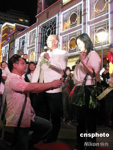 5月9日晚,在廣西柳州市五星商業步行街華僑大廈前,一場鬧市區當街下跪求婚的激情秀吸引了上百名路人駐足圍觀。中新社發 周瀟男 攝