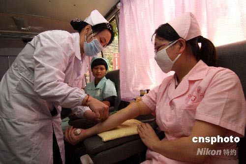 5月11日,湖南婁底市眼科醫(yī)院的護(hù)士在獻(xiàn)血。“5.12”國(guó)際護(hù)士節(jié),婁底市眼科醫(yī)院、婁底口腔醫(yī)院、東方醫(yī)院的100多位護(hù)士,在節(jié)日前無(wú)償獻(xiàn)血。中新社發(fā) 郭國(guó)權(quán) 攝