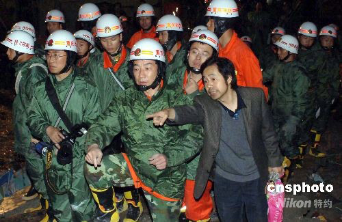 四川汶川縣5月12日發(fā)生7.8級地震后,北川縣北川中學(xué)受到極大的迫害,將近三千名的學(xué)生中僅有一半學(xué)生生存,另一部分學(xué)生因樓房倒塌而遇難或受傷。抗震消防隊員不顧艱險連續(xù)工作,利用不同工具挖掘被壓人員,并及時成功搶救出一批學(xué)員。圖為綿陽一位建筑設(shè)計人員輔助施工人員進(jìn)行搶險救災(zāi)。中新社發(fā) 鄒憲 攝