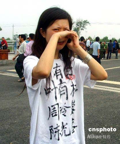 綿陽市抗震救災最大的救助點九州體育館容納了2萬多名來自北川、安縣等地的災民, 5月15日上午,北川地震災民家屬葉婷焦急地尋找親人。中新社發 霍潺 攝