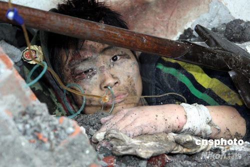 受災嚴重的四川省北川縣北川中學校舍全部倒塌,圖為5月13日拍攝的廢墟中的幸存學生。中新社發 張雷 攝