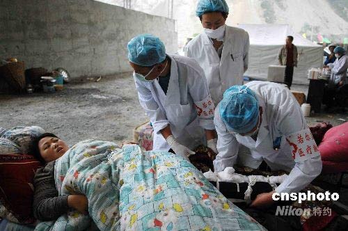五月十九日,被救出的汶川地震受傷災(zāi)民在野戰(zhàn)醫(yī)院得到救助。由武警醫(yī)療隊、空軍醫(yī)療隊、諾爾蓋醫(yī)療救護人員組成的聯(lián)合野戰(zhàn)醫(yī)院,目前正在當(dāng)?shù)貙嵤I救。中新社發(fā) 陳文 攝