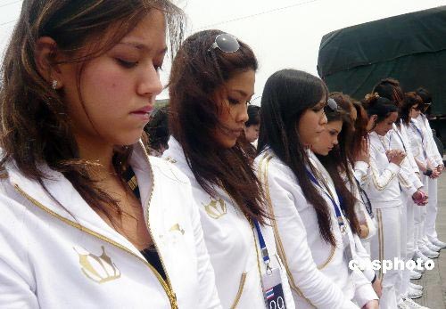 5月19日14時28分,為表達中國各族人民對四川汶川大地震遇難同胞的深切哀悼,中國國務院決定,2008年5月19日至21日為全國哀悼日。圖為正在中國廣西參加2008亞洲超級模特大賽的各國選手向四川汶川大地震遇難者默哀。中新社發 錢興強 攝