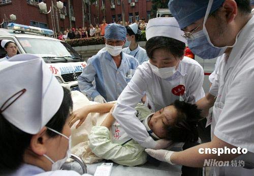 5月25日下午4時55分,從四川地震災區轉運福建省救治的第一批20名傷病員,安全抵達福建醫大附屬協和醫院。福建省首批接收的110名地震災區傷員,于25日下午和晚上分乘3架專機從成都飛抵福州。傷員們分別安排在南京軍區福州總醫院、省立醫院、福建醫大附屬協和醫院、福建醫大附屬第一醫院、省人民醫院、福州市第一醫院等6家醫院救治。中新社發 楊婀娜 攝