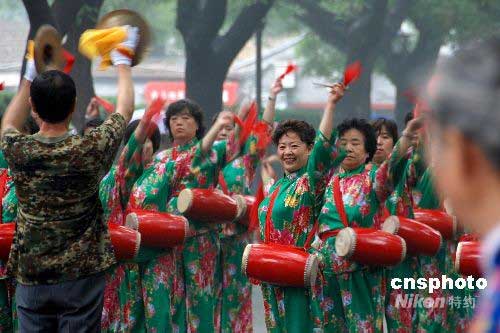 6月14日是中國第三個文化遺產日,整治一新的國子監(jiān)街喜迎開街。國子監(jiān)街因孔廟國子監(jiān)在此而得名,距今已有700多年的歷史,是北京市唯一一條被列入市級文物保護單位的街道,也是北京保留下來的唯一一條牌樓街。圖為傳統(tǒng)腰鼓舞喜迎開街。中新社發(fā) 魏瑋 攝