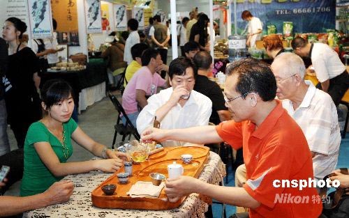 7月3日,為期4天以“綠色、健康、茶文化”為主題的2008大連第四屆國際茶博會暨世界華僑華人以茶會友大會在大連星海會展中心開幕。本屆茶博會,共設展位200余個。展會期間除舉辦茶葉、茶具壺、茶藝賽外,還將舉辦“東北暨環渤海地區茶博覽第二次峰會”、“以茶會友”文藝演出、茶健康知識講座、茶葉推廣會、現場炒茶表演等十大活動。中新社發 劉德斌 攝