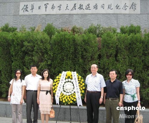 七月二十七日下午,臺北縣南京參訪團在侵華日軍南京大屠殺三十萬遇難同胞紀念館,為三十萬遇難同胞默哀、敬獻花圈。參訪團原由臺北縣長周錫瑋率領,但周錫瑋因需返島內處理緊急事務,在簽署完南京市與臺北縣經貿文化合作備忘錄后便離寧,參訪團其他成員則繼續行程。中新社發 唐娟 攝