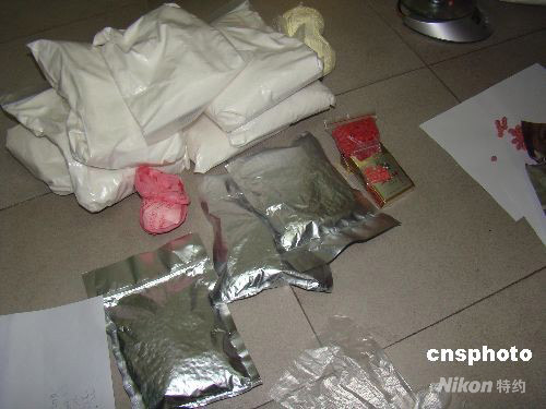 海口警方九月四日公布破獲一起特大販賣毒品的案件,繳獲毒品十公斤,抓捕毒販十名,是今年以來海南省破獲的最大宗販毒案,毒品品種包括海洛因、冰毒、K粉、搖頭丸等六七個品種。中新社發 王辛莉 攝