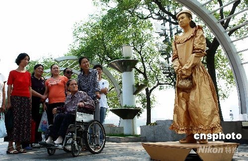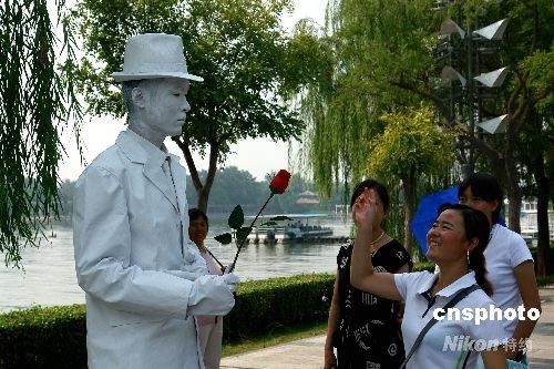 9月14日,在天津水上公園中秋游園會上,由四人組成的人體活雕塑展成了亮點。這些人體活雕塑在進行表演的同時,還與游客合影、互動,給中秋游園會增添了靚麗風景。中新社發 展曉仁 攝
