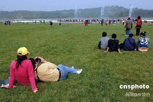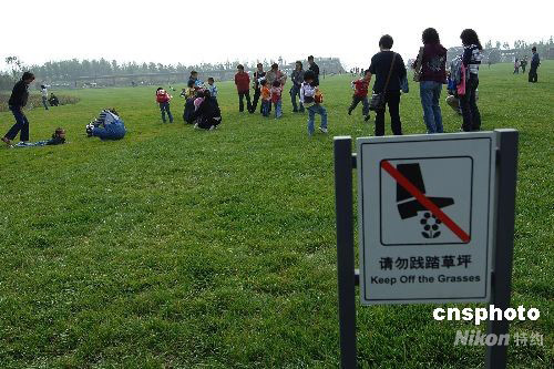 9月29日,北京奧林匹克森林公園露天劇場大草坪被迫準許游人進入休閑,草坪大面積遭到踐踏。北京殘奧會閉幕后,該草坪在禁止游人進入時,一直有游客違規強行進入,并不斷與保安人員發生沖突。鑒于近期警員、保安、志愿者紛紛休假離去,森林公園管理機構正式撤除了草坪阻攔線,默許游人在此行走,滯留。中新社發 鄒憲 攝