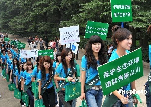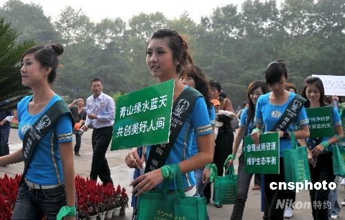 2008年10月3日,參加“中國國際年度綠色風云人物”頒獎盛典暨“MISS EARTH世界綠色環保大賽中國總決賽”的來自全國27個省、直轄市、自治區的40位“綠色天使”手拿宣傳牌、環保袋等物品來到南京中山陵風景區,參加公益環保宣傳活動。中新社發 劉建民 攝