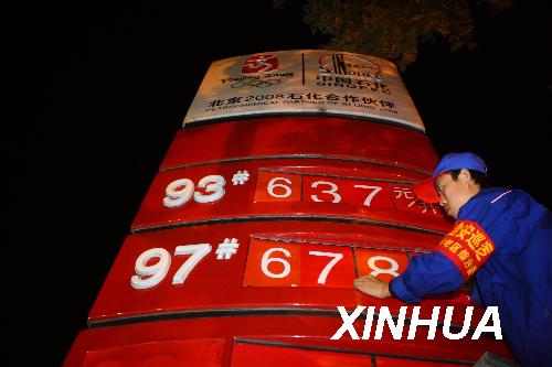10月7日凌晨,北京一加油站的工作人員在更換汽油價格標(biāo)簽。當(dāng)日零時,北京汽油價格上漲,93號汽油漲至每升6.37元,97號汽油漲至每升6.78元。新華社記者 邢廣利 攝