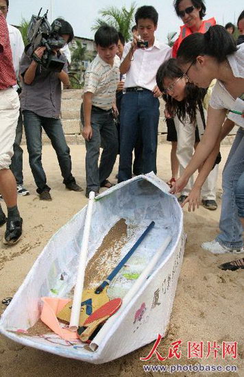 福建省廈門市廈大白城海面上,朱亞林坐在自己親手打造的紙船用乒乓球當(dāng)作雙槳開始試航。