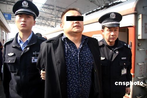 2008年10月13日,沈陽鐵路公安處乘警支隊在成都開往沈陽的北的K388列車上抓獲一名潛逃十年的殺人犯,犯罪嫌疑人池繼云是四川金堂縣人,1973年生人,1998年12月13日,他在四川省都江堰市風行酒廊殺死2人重傷2人,十年來一直負案在逃,不想這次列車上被沈陽鐵路公安抓獲。中新社發 趙敬東 攝