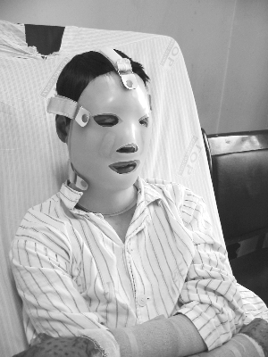 半年前,李剛在工作時,面部被乙炔氣體大面積燒傷,雙手也殘疾了。性格開朗的他變得自閉起來。目前,李剛正在東南大學附屬中大醫院康復科,戴著一種特殊的面具進行壓疤治療,現在面部疤痕少了很多,也漸漸走出了心理陰影。而采用這種特殊方法對燒傷患者進行治療,在南京是第一例。