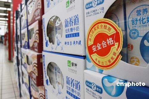 10月16日,北京一度下架的個別品牌液態(tài)奶,經(jīng)權(quán)威機(jī)構(gòu)檢驗(yàn)合格后,貼上安全合格標(biāo)識重新上架銷售。目前“下架奶”生產(chǎn)廠家已經(jīng)將重新檢驗(yàn)且合格的批次報告?zhèn)鬟_(dá)到超市,被檢產(chǎn)品則“仍在廠內(nèi)加緊貼上象征合格的綠色統(tǒng)一標(biāo)識”,預(yù)計(jì)蒙牛、伊利等品牌液態(tài)奶最遲會于17日重新回到零售終端。中新社發(fā) 鄭雄增 攝