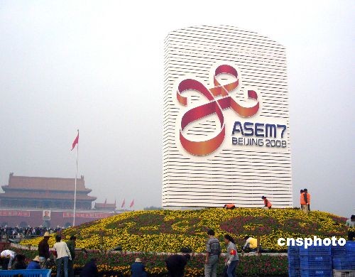 2008年10月20日,北京第七屆亞歐首腦會議標識在天安門廣場亮相,園林工人正在加緊進行花壇的完善工作。據悉,第七屆亞歐首腦會議將于10月24日至25日在京舉行。中新社發 玉龍 攝