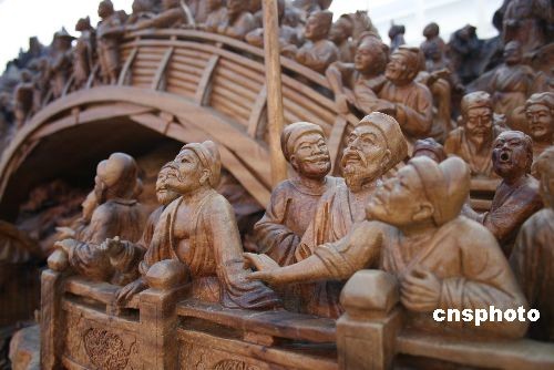 10月21日,長18米的巨型根雕《清明上河圖》在開封東京藝術中心廣場展出。據(jù)工作人員介紹,這一作品原木是一株生長在東南亞熱帶崇山峻嶺中的香樟古木,樹齡在2300年以上,樹高百米,樹干直徑4米,根徑20米,完全暴露風干近10年。后以北宋畫家張擇端的《清明上河圖》為藍本,由福建35位藝術家和工匠歷時5年精雕細刻而成。雕刻完成后,作品長18米,高2.56米,寬2米,重12噸。 據(jù)悉,這一來自福建莆田的巨型香樟木根雕《清明上河圖》作品,已經(jīng)申報吉尼斯世界紀錄。中新社發(fā) 劉書亭 攝