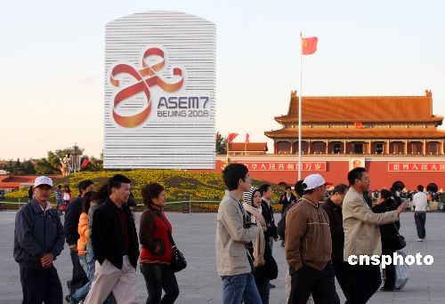 10月23日,北京天安門(mén)廣場(chǎng)一派祥和,以亞歐首腦會(huì)議為主題的花壇光彩奪目,第七屆亞歐首腦會(huì)議將于10月24日至25日在京舉行,這是繼2008奧運(yùn)會(huì)后北京舉辦的一次重要的國(guó)際性盛會(huì)。中新社發(fā) 吳芒子 攝