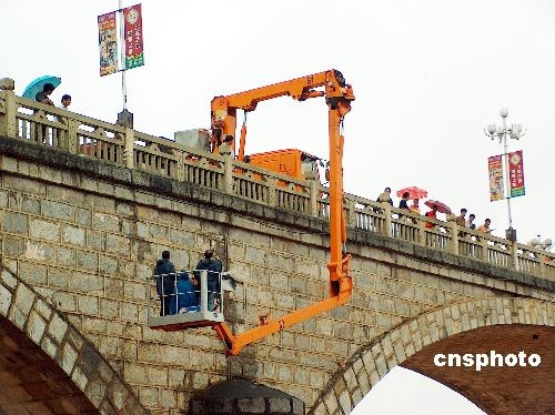 11月2日上午,廣西南寧公路局工程技術人員冒細雨為中國當代最長的石拱橋——--龍州大橋“把脈探傷”。龍州大橋建于上世紀60年代,為七拱方塊石料結構,橋長約252米。在通車的43年來,已經受了4次大洪水的考驗。中新社發 馮文 攝