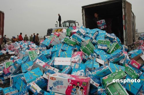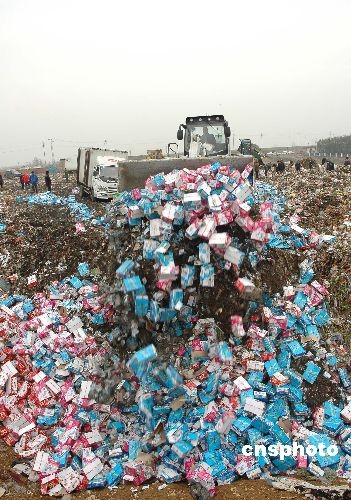 11月17日,河南南陽市臥龍區在生活垃圾處理場集中銷毀“三鹿”問題液態奶。當日,該區共銷毀從經銷商回收和工商機關監督統一下架、集中扣押、封存和消費者退回的問題“三鹿”純牛奶、酸奶、早餐奶等液態奶16噸,在生活垃圾場采取碾壓、深埋,進行無害化處理。中新社發 熊運彬 攝