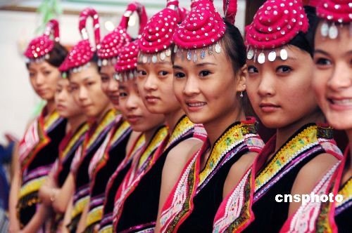 十一月十七日,一家座落于畬族地區、業界知名度頗高的茶企業,請來一群美貌畬族姑娘在福建武夷山“第二屆海峽兩岸茶業博覽會”展覽館里出任企業產品形象大使,亦為茶博會增添了一道亮麗的風景線。中新社發 鄭祚聲 攝