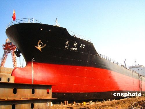 11月20日,一艘由中國農民制造的最大貨船,屹立在南京浦口“十里造船帶”的造船廠碼頭準備下水。這艘由“中華民間造船水運第一村”南京武家嘴村農民制造的貨船載重1.6萬噸、長146.2米、寬22米、進深11米,是迄今全國農民中造出的最大貨船。中新社發 谷昌旺 攝