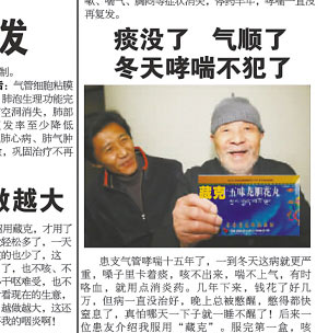 “患友介紹我服用了‘藏克’。服完第一盒,咳嗽、胸悶就緩解多了。”昨天(22日),看著我市(重慶市)某報上的一則藥品廣告,90歲高齡的老人張治欽感到納悶,“我從來沒得過這病,卻上了該藥的宣傳廣告!