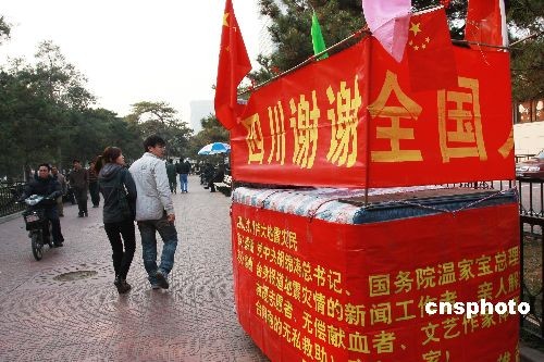 11月24日,四川汶川特大地震災區災民寫給全國人民的感謝信亮相北京街頭,巨型橫幅標語吸引不少路人的目光。中新社發 鄭雄增 攝