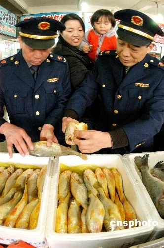11月24日,連云港市連云工商分局針對海鮮市場出現有毒染色黃魚的現象,組織執法人員進行了突擊檢查,檢查中發現一些不法商販在出售“美容”黃魚。中新社發 王春 攝
