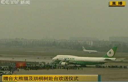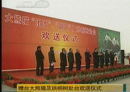 12月23日,贈臺大熊貓“團(tuán)團(tuán)”“圓圓”及珙桐樹赴臺歡送儀式在四川成都雙流機(jī)場舉行。