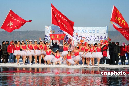 2009年1月1日,遼寧省沈陽市歡度新年暨全國“冬泳日”冬泳表演在棋盤山冰雪大世界秀湖舉行。150多名冬泳愛好者進行了“天鵝湖”表演及跳水表演。中新社發 劉寶成 攝