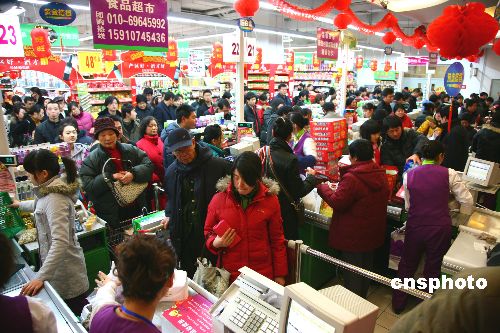 1月24日,北京市懷柔區(qū)“年貨”市場人潮涌動(dòng),市民紛紛走進(jìn)食品超市選購年貨,呈現(xiàn)出紅紅火火過大年的喜慶景象。中新社發(fā) 卜向東 攝