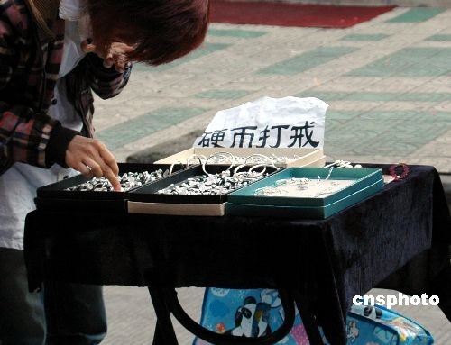 3月11日,在浙江溫嶺街頭,有人擺地攤叫賣“硬幣打戒”,地攤上寫著廣告。據女攤主稱,每枚戒指都是由一枚1元面值硬幣打成的。據了解,硬幣打戒指屬違法行為,《中華人民共和國人民幣管理條例》第二十七條第一款明確規定,“禁止故意毀損人民幣”;第四十三條指出,“故意毀損人民幣的,由公安機關給予警告,并處1萬元以下的罰款。中新社發 江勇兵 攝