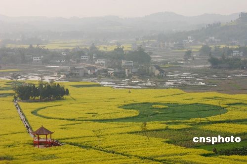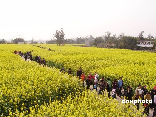 3月15日,游人在重慶市潼南縣崇龕油菜花基地觀賞金燦燦的油菜花。第二屆重慶潼南菜花節(jié)自3月5日開展以來,每天到此賞花的游人絡(luò)繹不絕。3萬余畝油菜花被兩江水環(huán)抱,游人或泛舟環(huán)游,或登高望遠,甚至可乘熱氣球升空俯瞰萬畝油菜花織出的太極圖案。中新社發(fā) 陳仕川 攝