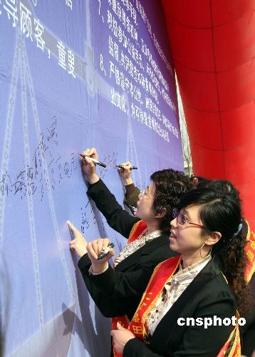 三月十七日,北京工商舉行紀念《中華人民共和國合同法》十周年活動。京城許多商家在執行《合同法》誠信、履約、規范簽字版上簽字。中新社發 任海霞 攝