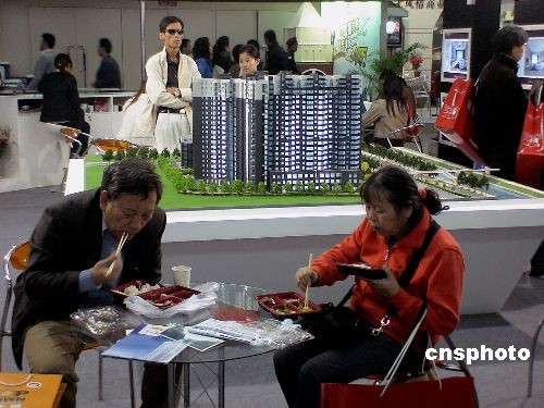 北京地產市場沉寂一冬迎來三月陽春,看房客們開始成群結隊熱鬧行動。有樓盤推銷商向可能出手買房者贈送中午盒飯,期望買賣做成。中新社發 賈國榮 攝