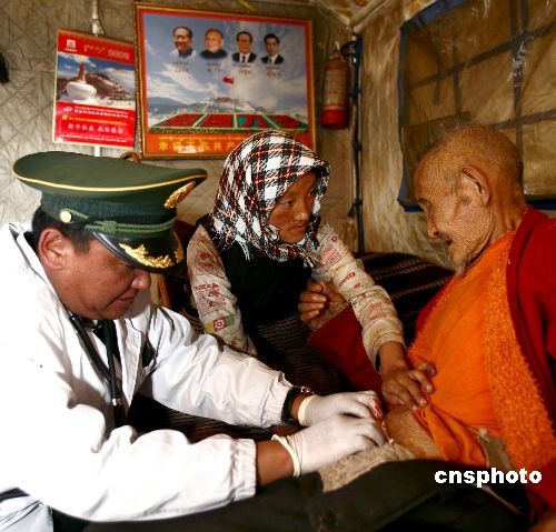 3月18日,武警西藏總隊醫院派出專家巡診團,來到拉薩市當雄縣格達鄉羊易村10.6地震災區,對因在地震中受傷的10余名傷員進行跟蹤治療,并為其他災民進行了春季防病知識宣講及診斷治療。 中新社發 張權 攝