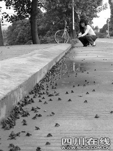 昨日,在豐樂水庫邊生活已30年的居民萬女士說,她發現有小蟾蜍從水庫里跳上岸是在一周前,當時數量較少,很多人都沒留意。昨日一早,眼前景象讓她和鄰居們大吃一驚:原先“單兵”上岸的小蟾蜍此時已成“集團軍”,公路上、道路邊、庫堤上、緊鄰水庫邊的居民樓房墻壁上,到處都爬滿了小蟾蜍,努力地朝同一個方向跳去。