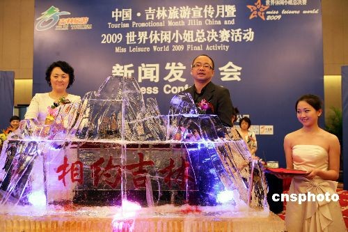 4月10日,由吉林省旅游局主辦的“中國·吉林旅游宣傳月暨2009世界休閑小姐總決賽”新聞發布會暨啟動儀式在北京舉行。此次活動將邀請來自全球80個國家和地區的休閑小姐、20國駐華大使及夫人、100家新聞媒體,走進吉林、歡聚吉林,借助“美麗經濟”,讓世界了解吉林,讓吉林走向世界。在6月28日舉行的總決賽上,通過民族服飾展示、泳裝展示、旗袍展示、晚裝展示、才藝展示等環節,評選出2009世界休閑小姐總決賽前5名及各類單項獎。中新社發 趙雋 攝