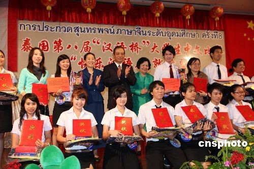 6月6日,由中國駐泰國大使館和泰國教育部高等教育委員會聯合舉辦的泰國第八屆“漢語橋”大學生中文比賽在曼谷城市酒店舉行。選拔自泰國朱拉隆功大學、法政大學、皇太后大學等19所精英大學的19名選手用地道的漢語闡述了“快樂漢語,成就希望”的大賽主題,表達了泰國大學生對中國的期盼與祝福。經過4個多小時緊張激烈的比賽,由中泰雙方漢語專家組成的大賽評委會評出了一等獎2名、二等獎4名、三等獎6名、積極參與獎7名、優秀組織獎2所大學。當日獲得一等獎的來自博仁大學的董詩碧和易三倉大學的江振茂兩位同學,將代表泰國到中國參加全球決賽,其他選手也獲得了到中國進參加秋令營的獎學金。中新社發 顧時宏 攝