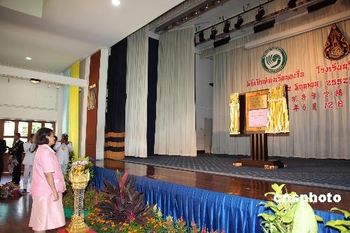 六月十二日的泰國吉拉達(dá)學(xué)校古老校園里洋溢著濃郁的中國文化氣息。在喧天的鑼鼓聲中,泰國瑪哈扎克里·詩琳通公主殿下按動(dòng)電鈕,寫有“吉拉達(dá)學(xué)校孔子課堂”的牌匾徐徐拉開帷幕,標(biāo)志著泰國第七家孔子課堂正式落戶這個(gè)坐落于泰國王宮里的學(xué)校。揭牌儀式上,詩琳通公主還興致勃勃地重酌墨水,揮毫為孔子課堂題寫了“學(xué)無止境 ”四個(gè)漢字,并勉勵(lì)泰國各孔子學(xué)院、孔子課堂擔(dān)當(dāng)起推動(dòng)泰國漢語教學(xué)進(jìn)步、促進(jìn)中泰友好關(guān)系發(fā)展的重任。中新社發(fā) 顧時(shí)宏 攝