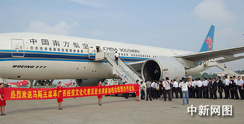 5月21日上午,廣西壯族自治區主席馬飚率領廣西經貿文化代表團乘坐包機從廣西南寧機場起飛,開始飛赴臺灣,廣西由此成為中國大陸各省、自治區、直轄市中第一個由省長級官員率團赴臺進行經貿文化交流的省份,此行也成為海峽兩岸交流史上的新突破。 馬飚率團此行赴臺是參加“兩岸產業高峰會議——2009年桂臺經貿合作論壇”,廣西經貿文化代表團人數多達1000余人,這也是大陸赴臺人數最多的參訪團。劉萬強 攝