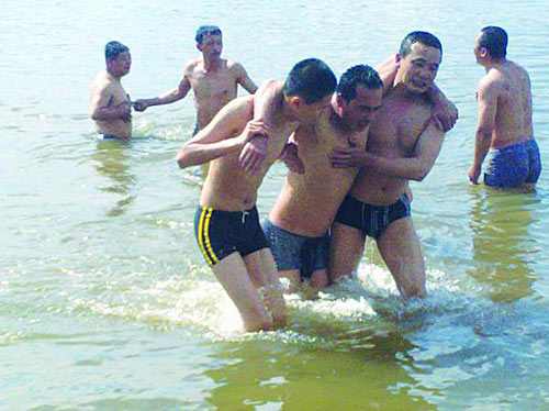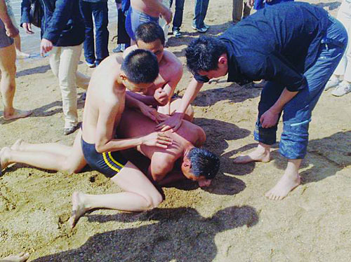 上岸之后,人們手忙腳亂地要學電視里的樣子給昏迷過去的韓德強擠壓心肺,小伙子再一次表現出來非凡的冷靜:“不能讓他仰臥!否則鼻腔里的水可能進入腦部。”小伙子半跪在岸邊把韓德強俯臥著放在自己腿上,拍打他的后背將水控了出來,絲毫沒在意自己的膝蓋已經被尖銳的沙石擦傷,流出了鮮血。